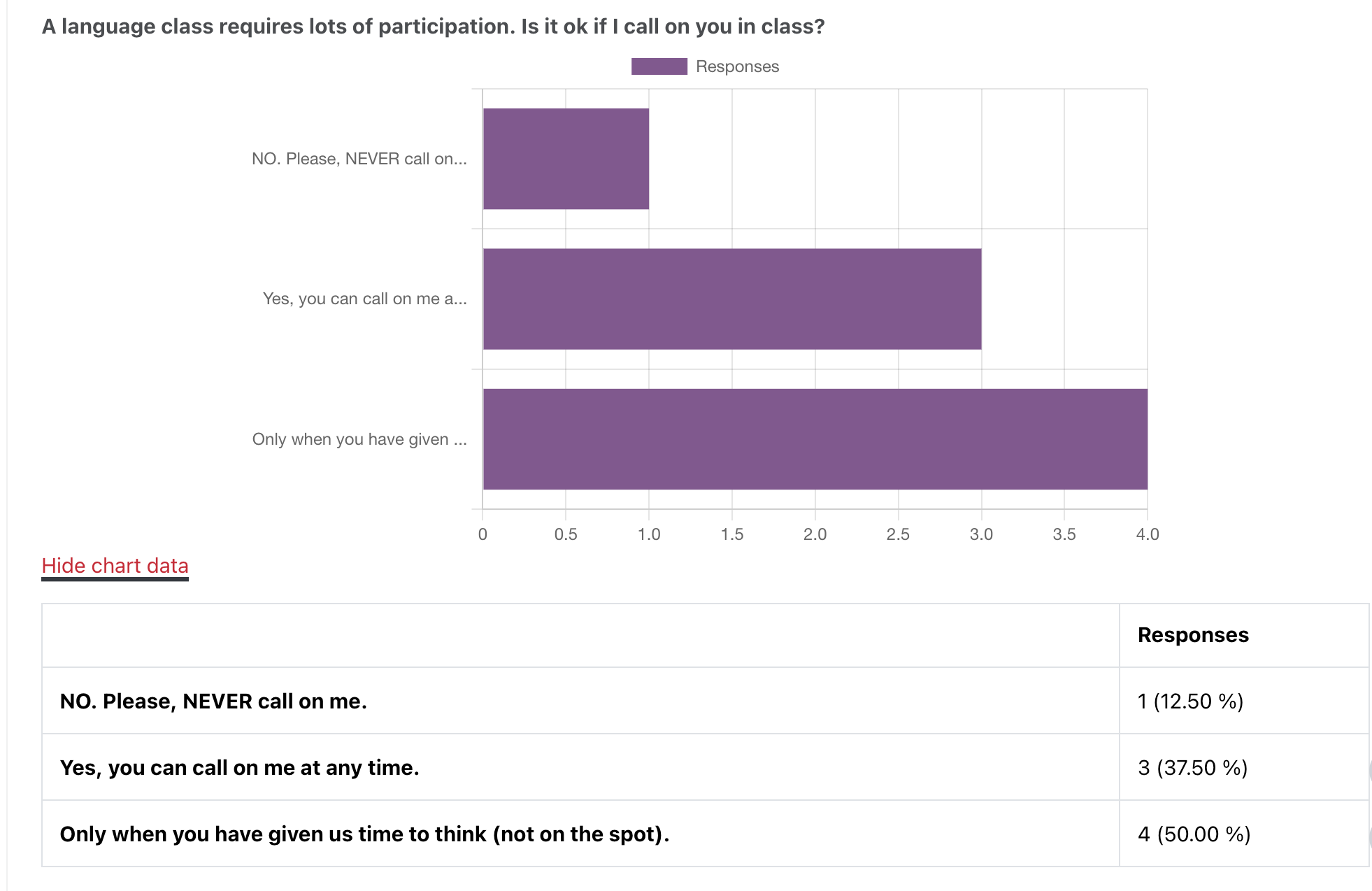 A language class requires lots of participation. Is it ok if I call on you in class? (Options: NO. Please, NEVER call on me / Yes, you can call on me at any time / Only when you have given us time to think, not on the spot.)